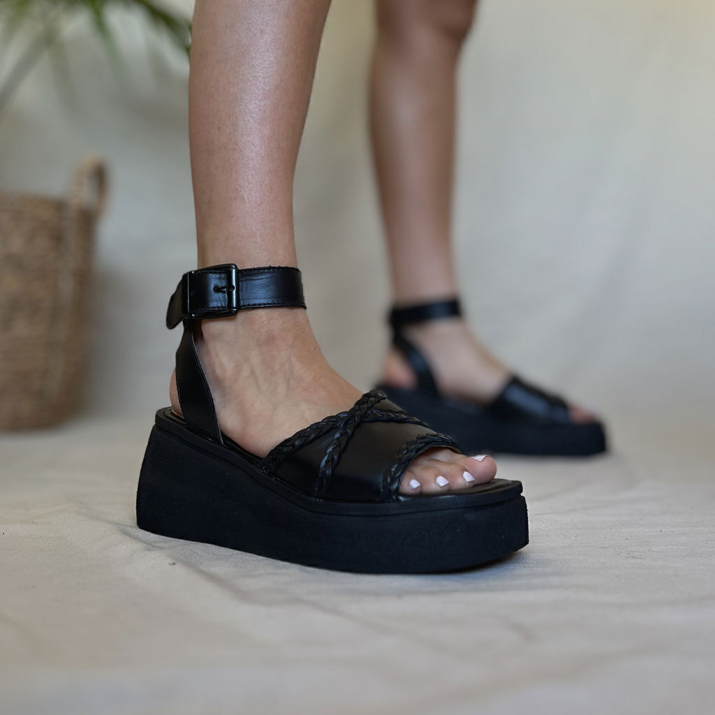 Sandalias de cuero vacuno liso color negro con detalles trenzados