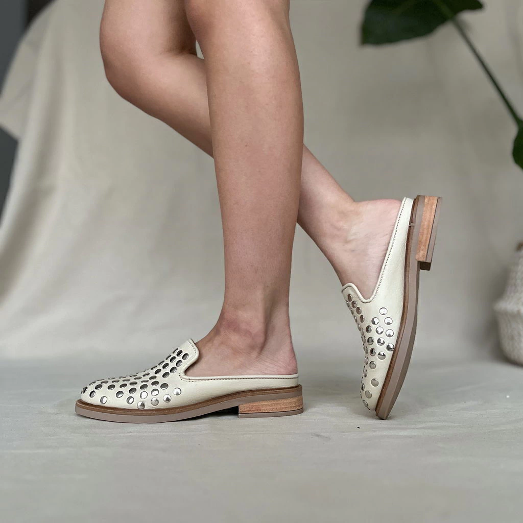 Zueco de cuero vacuno color manteca con detalle de apliques de tachas chatas metálicas