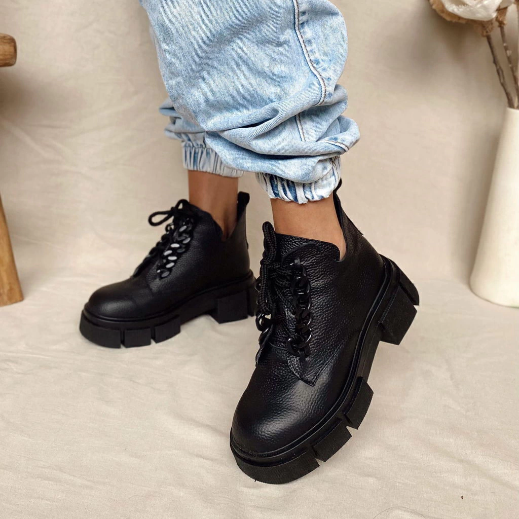 Borcego con plataforma de cuero vacuno graneado engrasado negro con detalle de cadena.
