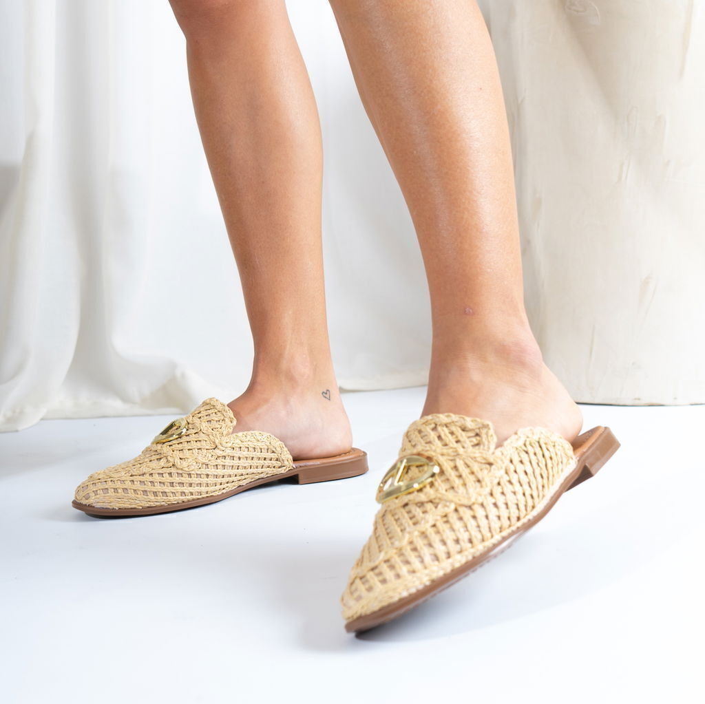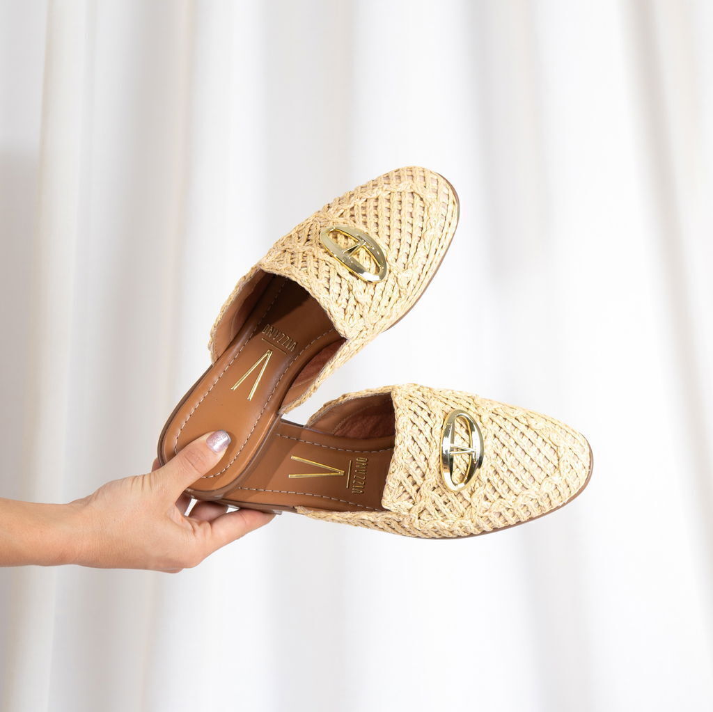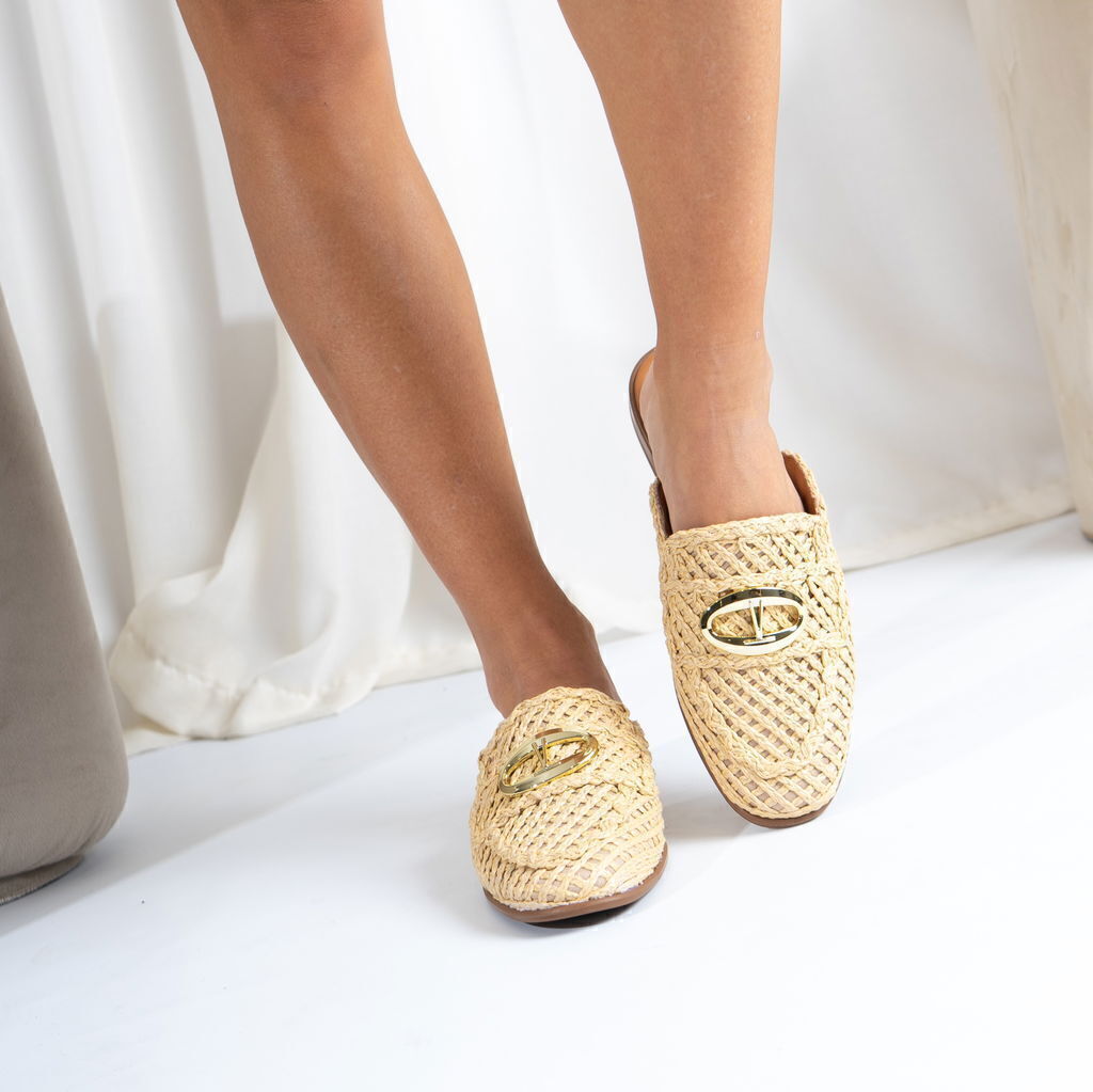 Zueco de material tipo rafia color natural con aplique de logo en dorado