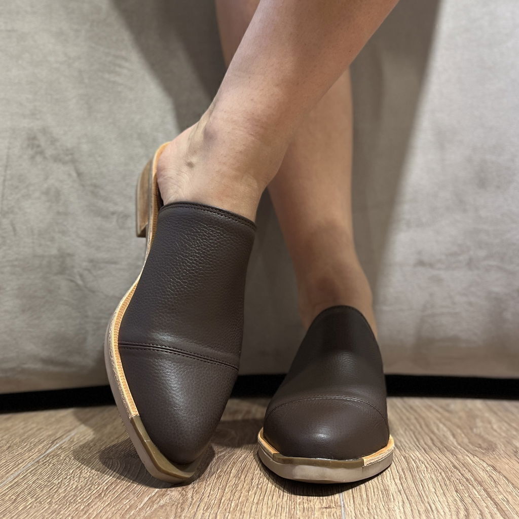 Zueco de cuero vacuno graneado color chocolate con terminación en punta.