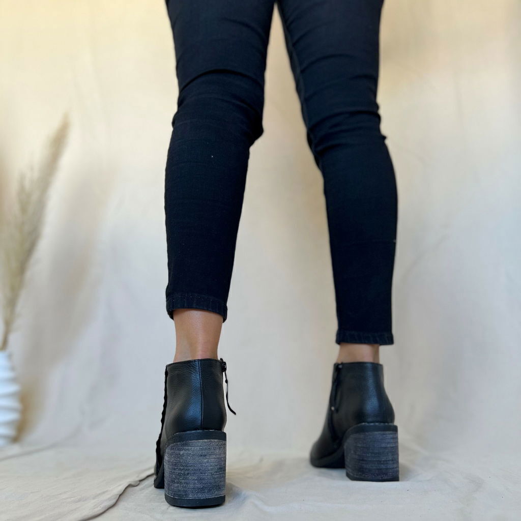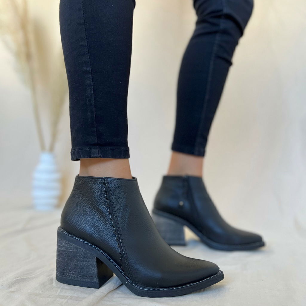 Bota taco medio de cuero vacuno con detalle lateral charolado