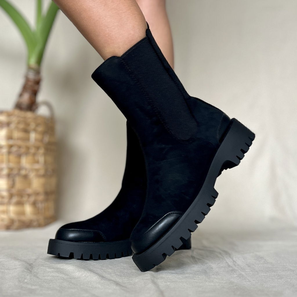 Bota de material sintetico gamuzado negro con refuerzos de cuero sintetico