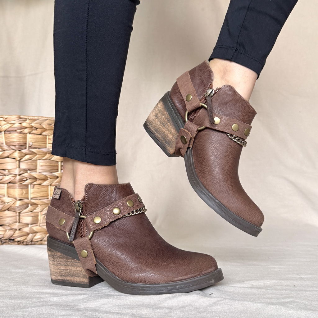 Bota de cuero vacuno chocolate con detalle de estribos en color dorado desmontables.