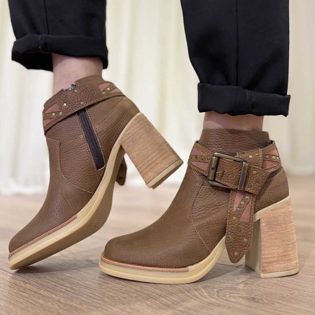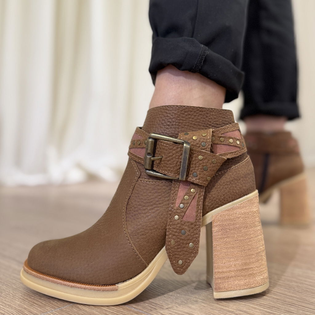 Bota media de cuero vacuno graneado color cognac con cinto desmontable con tachas hebilla en color bronce.