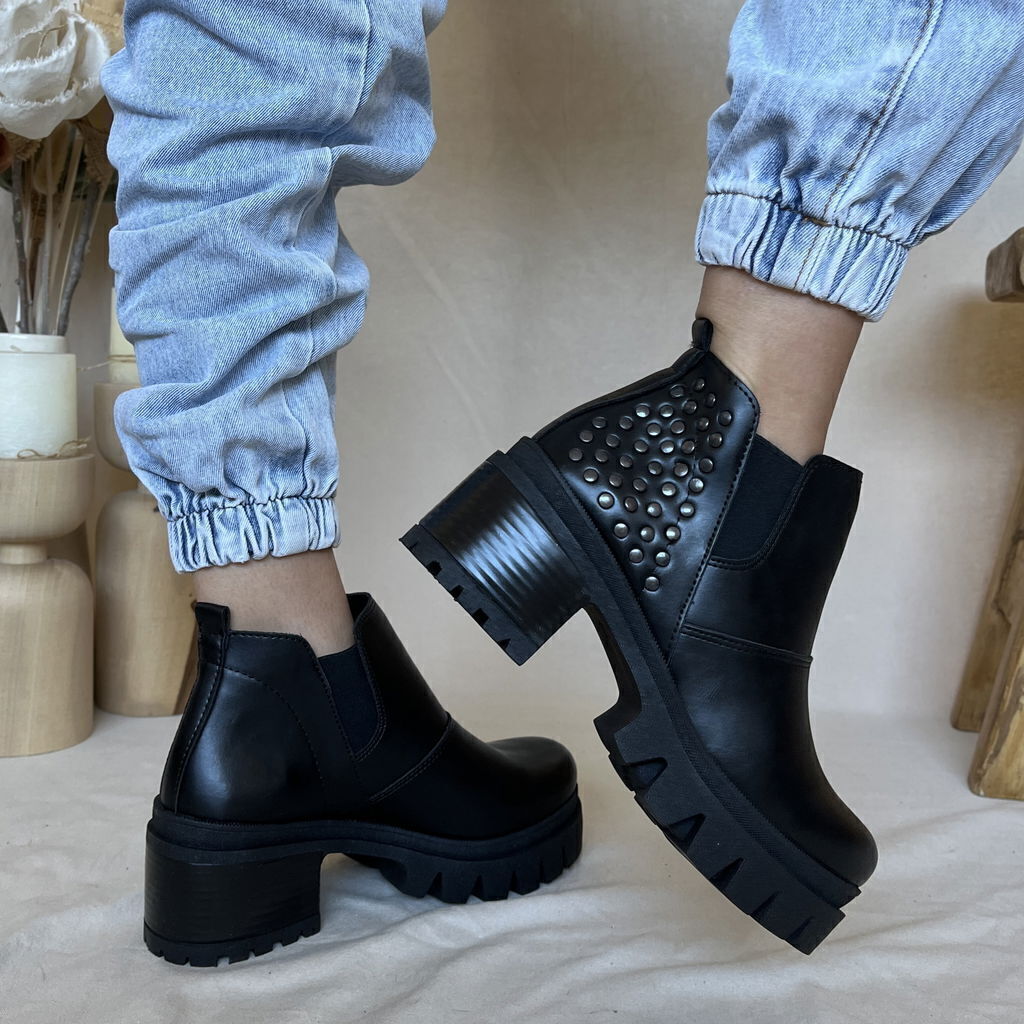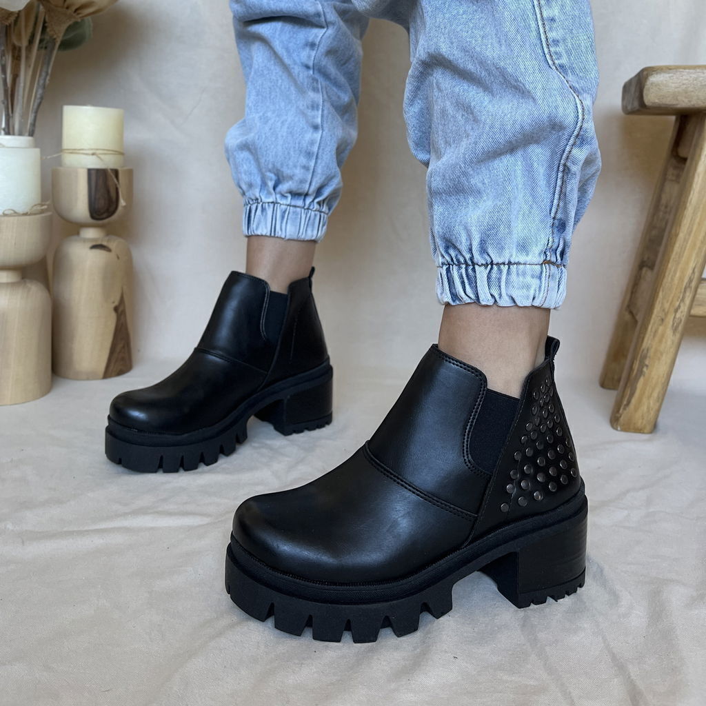 Bota caña corta cuero sintético liso de color negro con detalles tachas negras