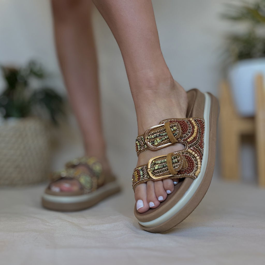 Zuecos de cuero gamuzado color cobre con bordado en capellada de canutillos de colores.