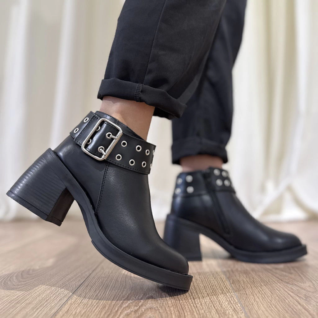 Bota caña baja de cuero vacuno color negro con detalle de hebilla metalica