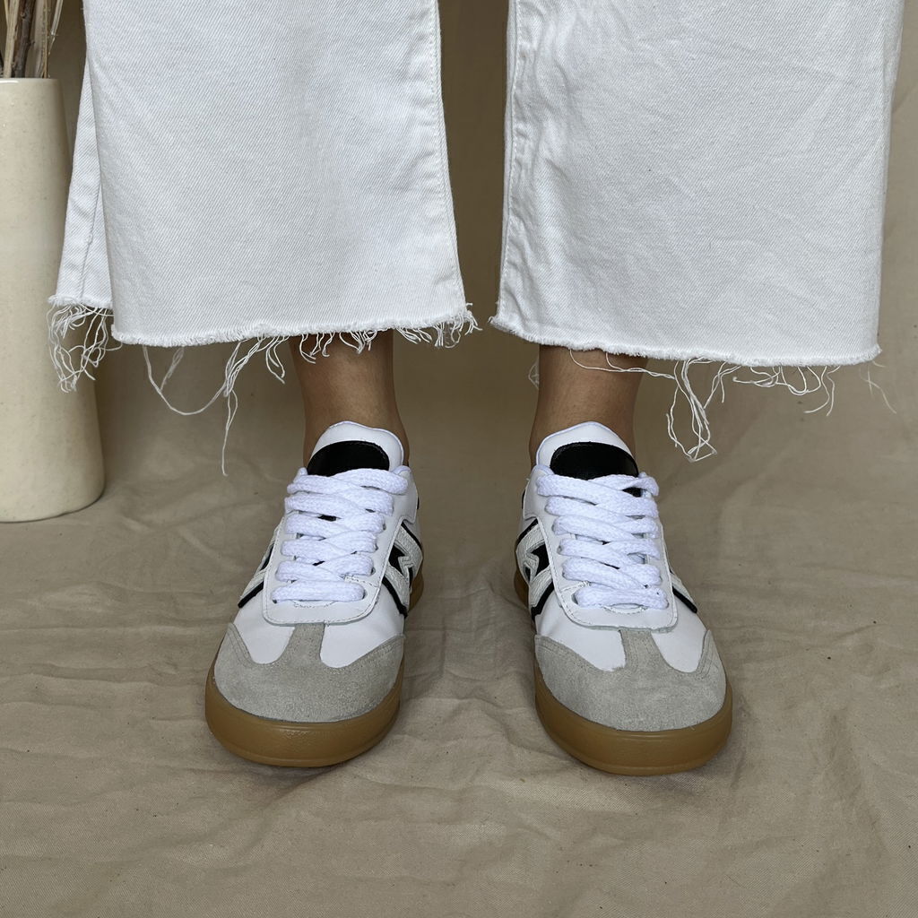 Zapatilla de cuero vacuno blanco combinado con negro.