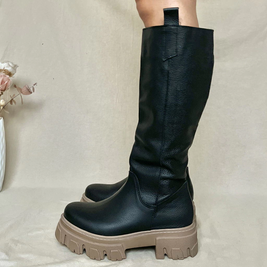 Bota caña alta de cuero vacuno graneado color negro con base color beige