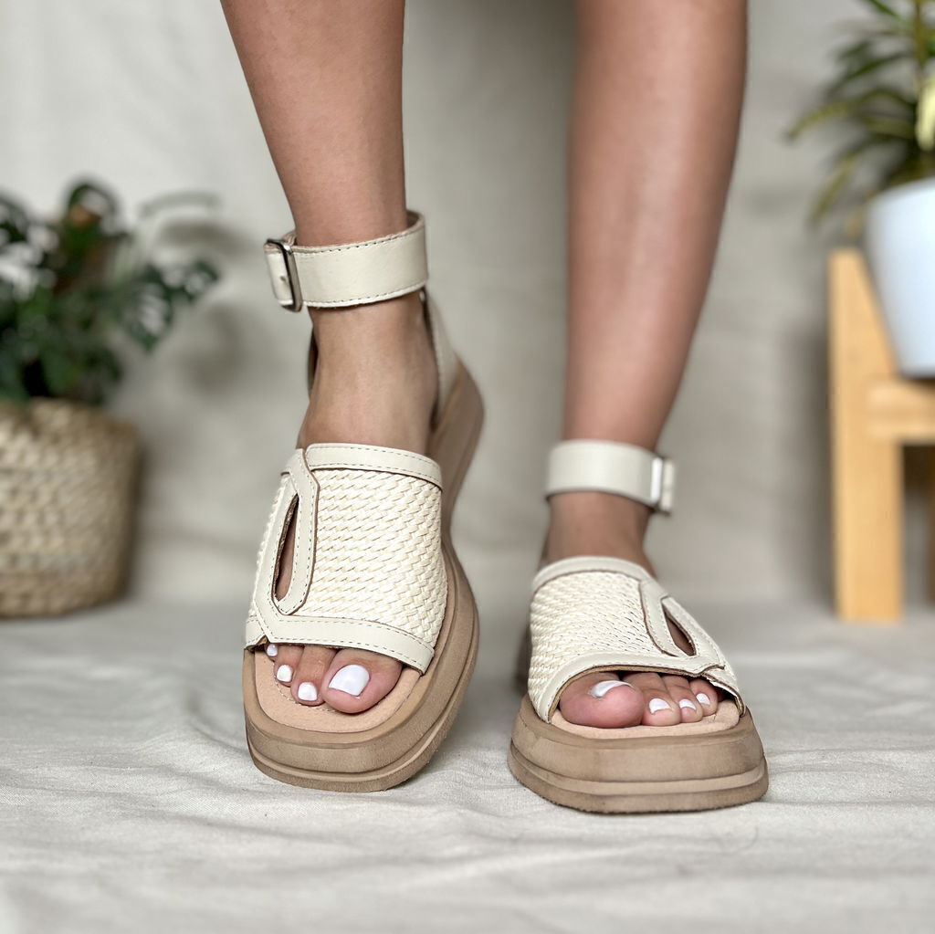 Sandalias de cuero vacuno color manteca combinada con rafia color nude en capellada