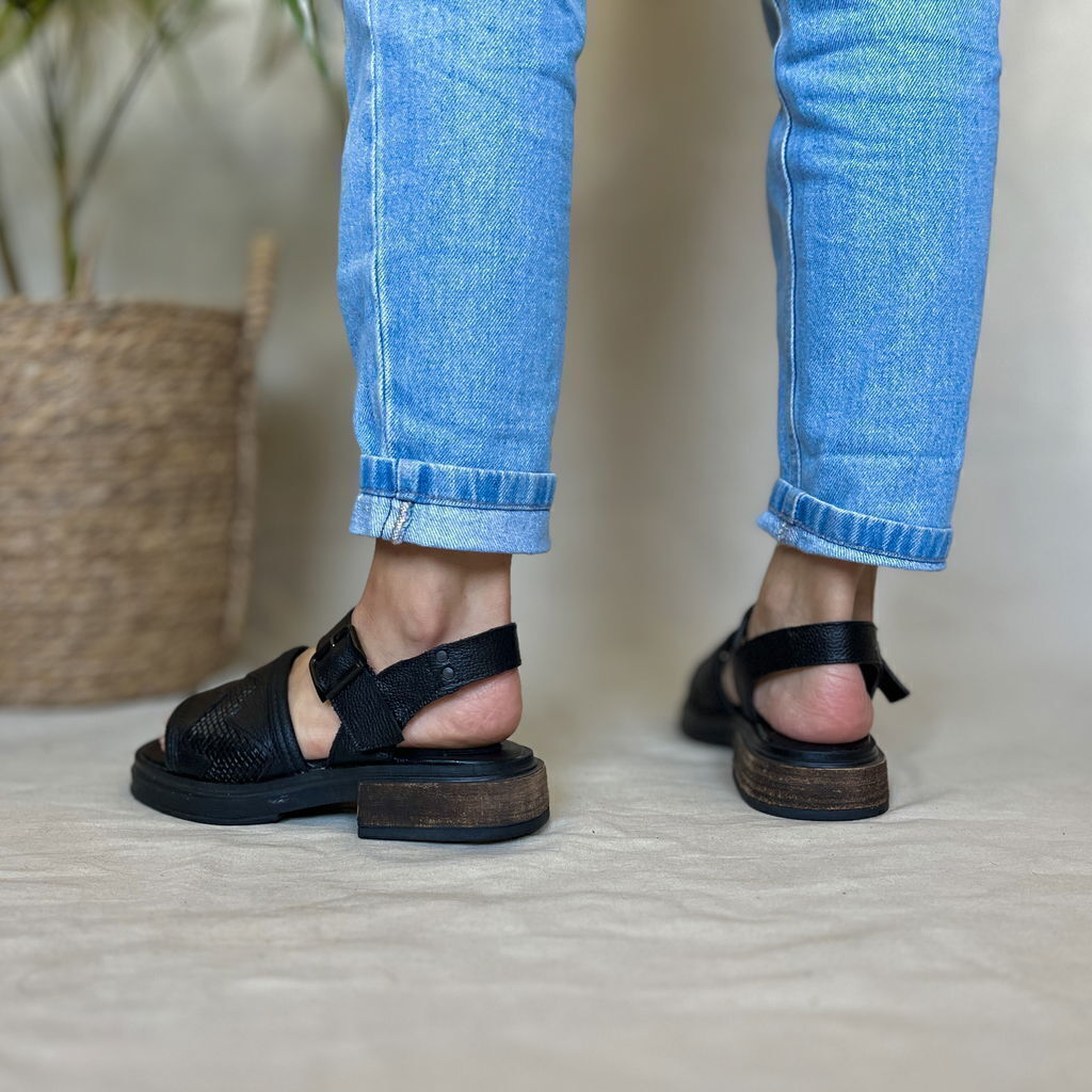 Cerramiento: hebilla metálica color negro ajustable en tobillo