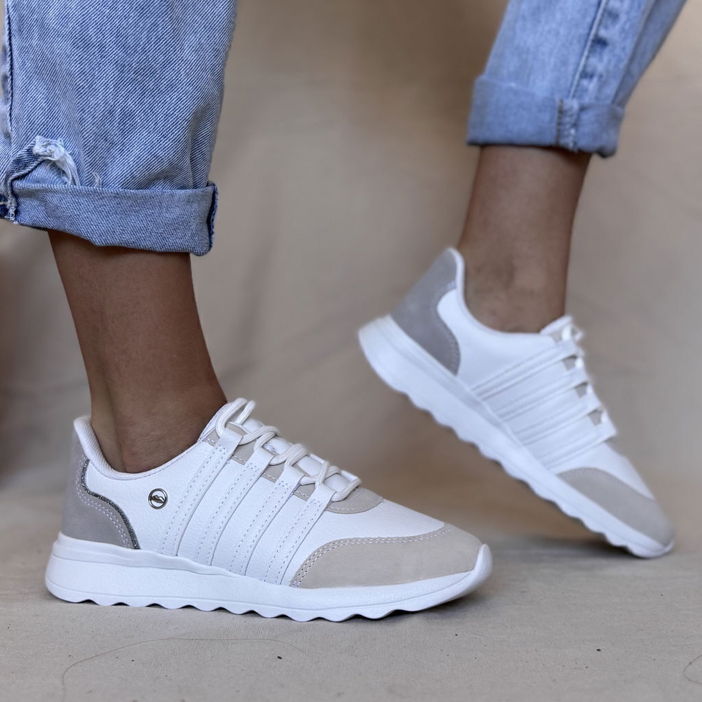 Zapatilla de cuero sintetico color crema con detalle gamuzado beige. base confort