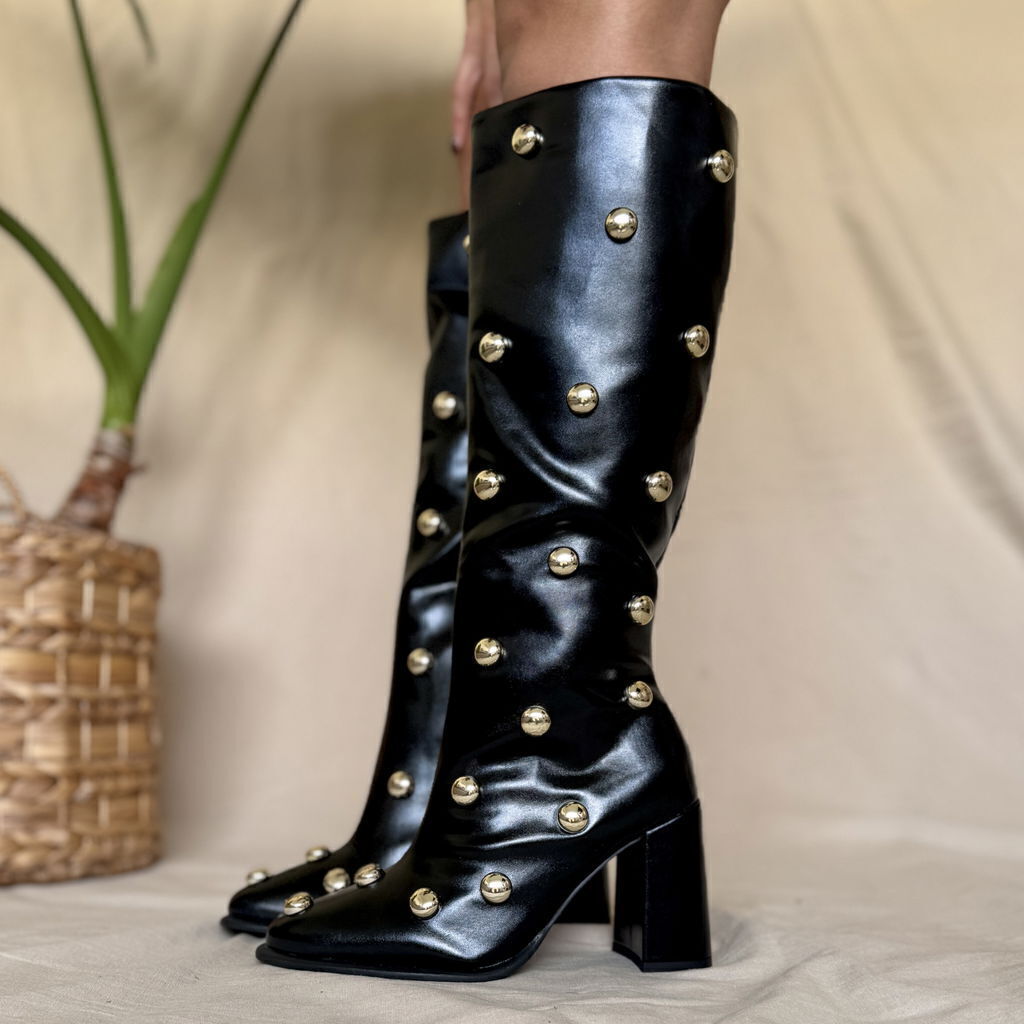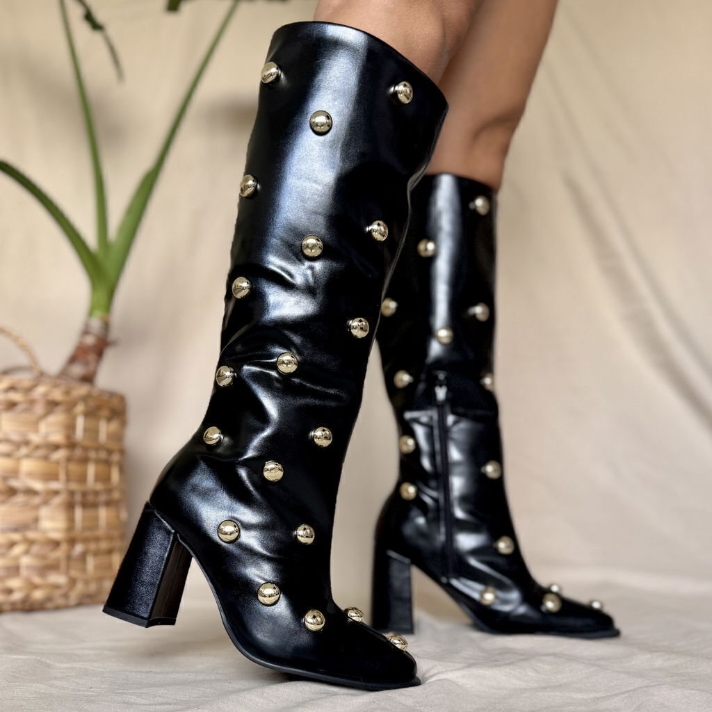 Bucanera de material sintético liso de alta calidad color negro con apliques de tachas metálicas redondas