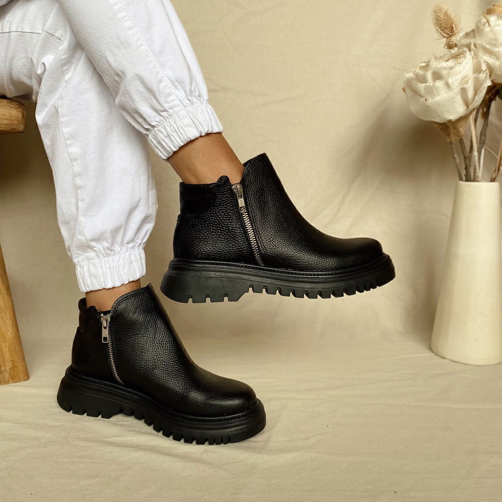 Bota baja de cuero vacuno graneado negro combinado con cuero vacuno liso negro