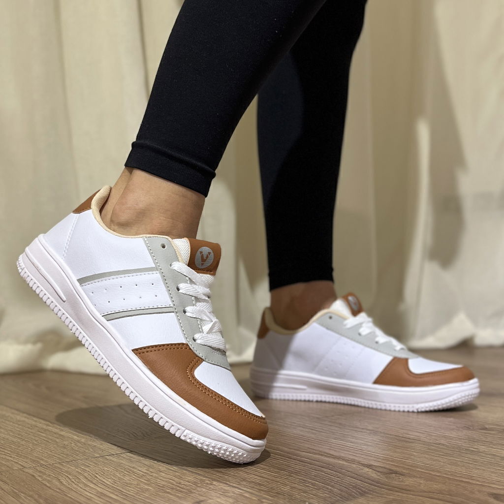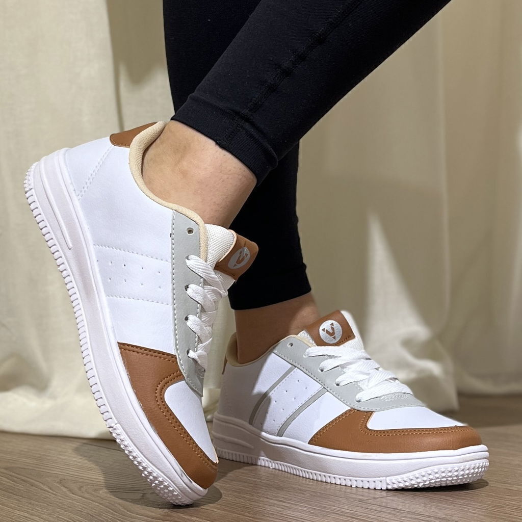 Material: material sintetico color blanco combinada con detalles en color gris y caramelo