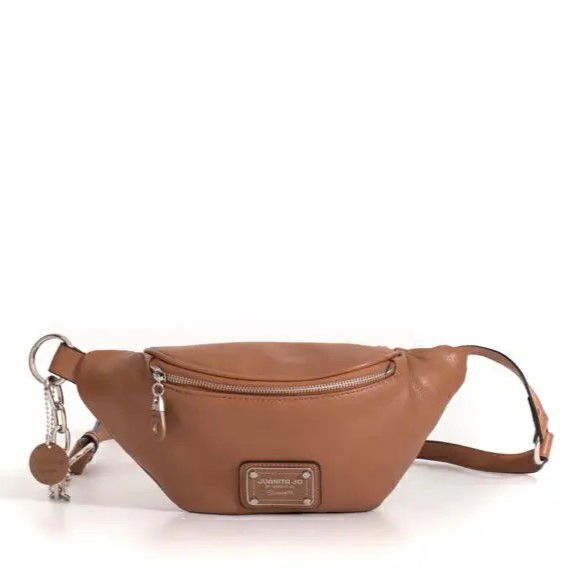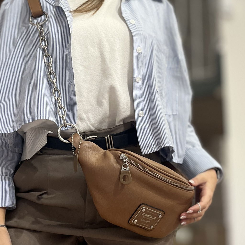 Riñonera de cuero sintético color marrón con detalle de cierre en parte frontal y trasera
