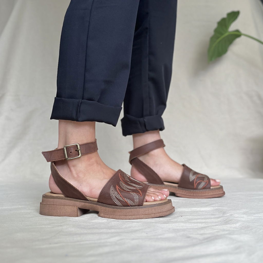 Sandalia de cuero vacuno marron con bordado en capellada a tonos