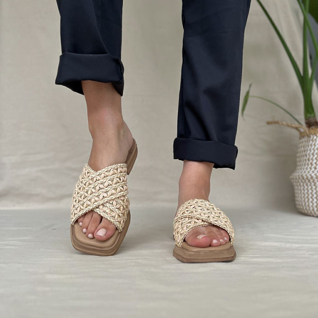 #BUCCOTIPS: Estas sandalias chatitas, con capellada tejida en tonos beige y crudo, son el complemento perfecto para tus looks de verano. La hebilla forrada en cuero ecológico en color beige añade un toque de sofisticación y comodidad. ¡Perfectas para disfrutar del sol con estilo!