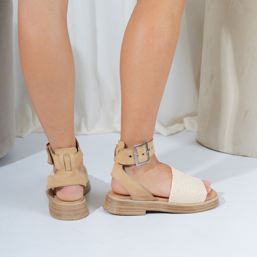 Sandalia de cuero vacuno caramelo combinadas con rafia elastizada