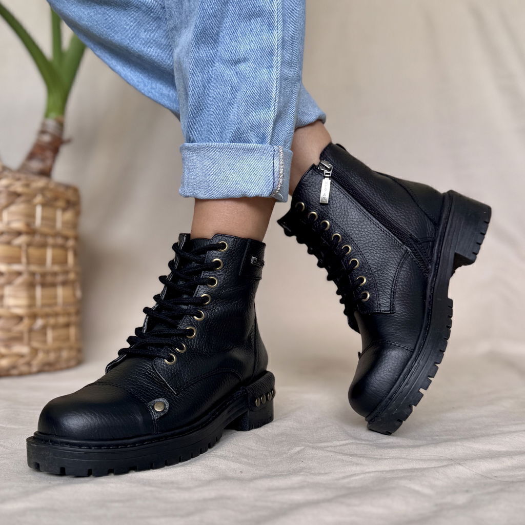 Borcego de cuero vacuno graneado color negro con tachas y costuras a tono.