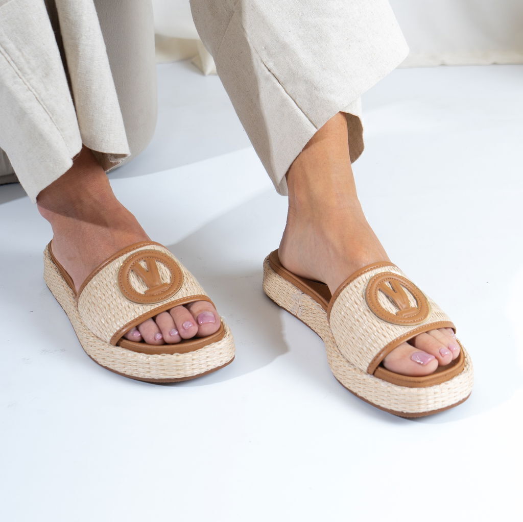 Material: material tipo rafia color natural combinado con sintetico color suela con aplique de logo en capellada