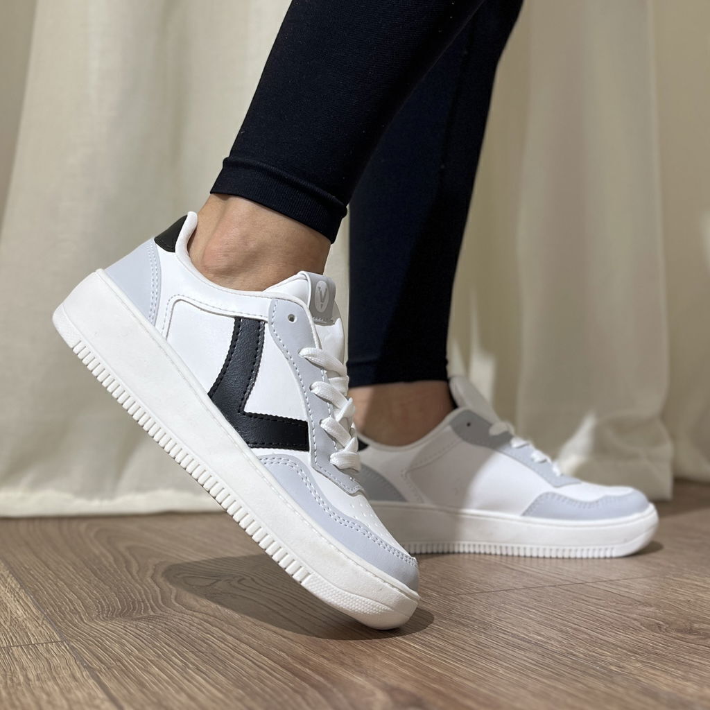 Zapatilla de material sintético color blanco con detalles en gris y negro.