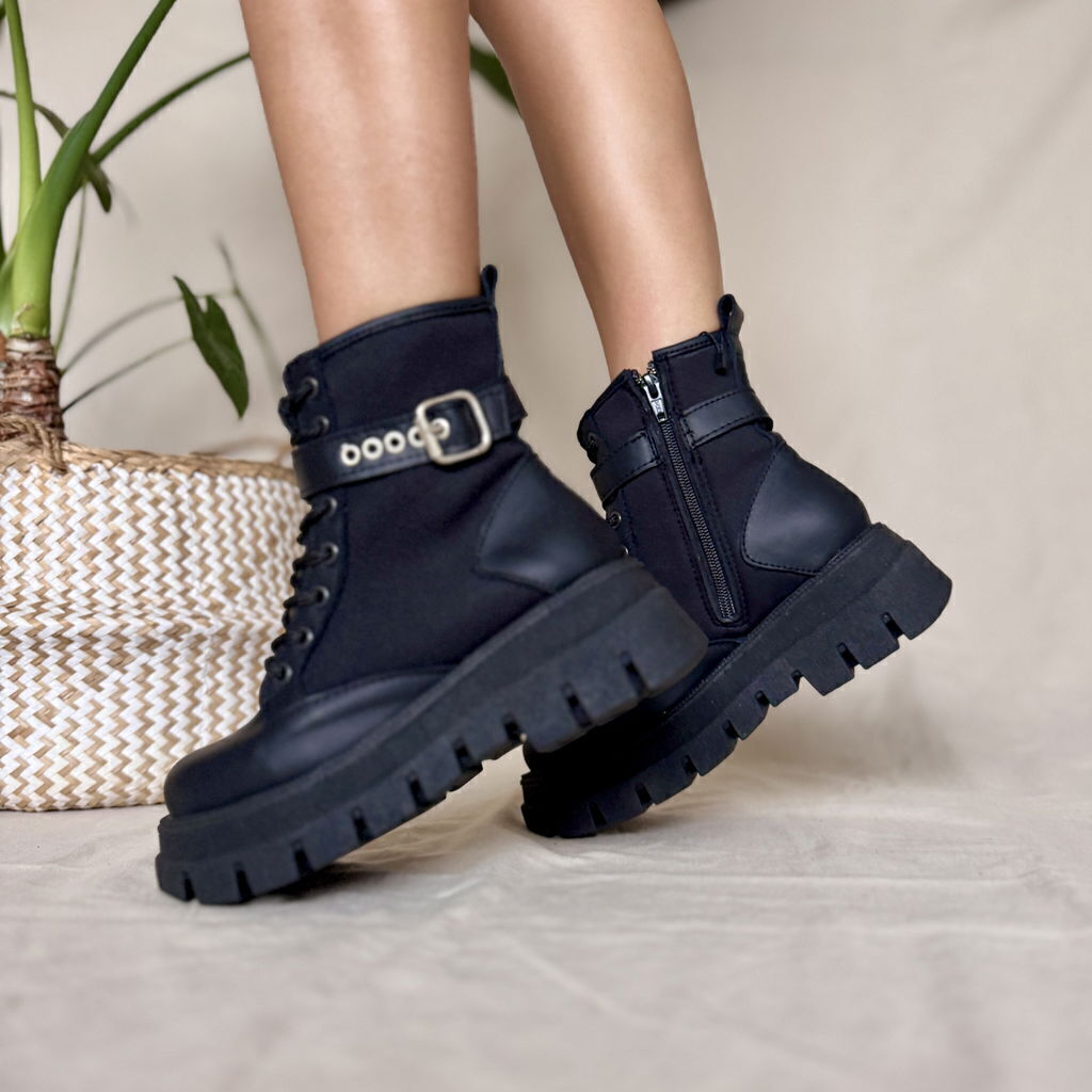 Borcego de cuero vacuno liso negro combinado con neoprene y aplique de hebilla metálica.