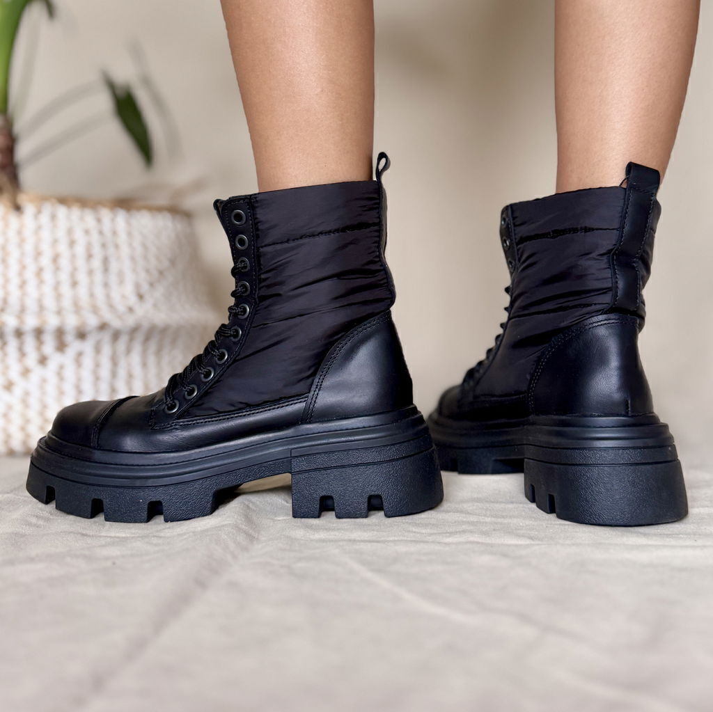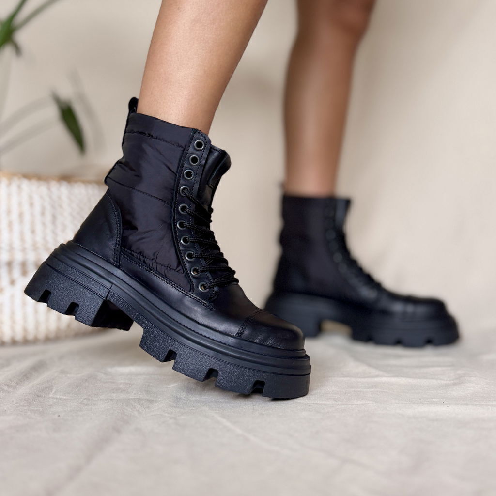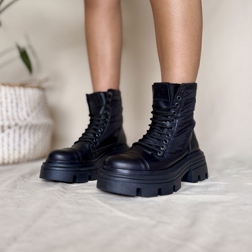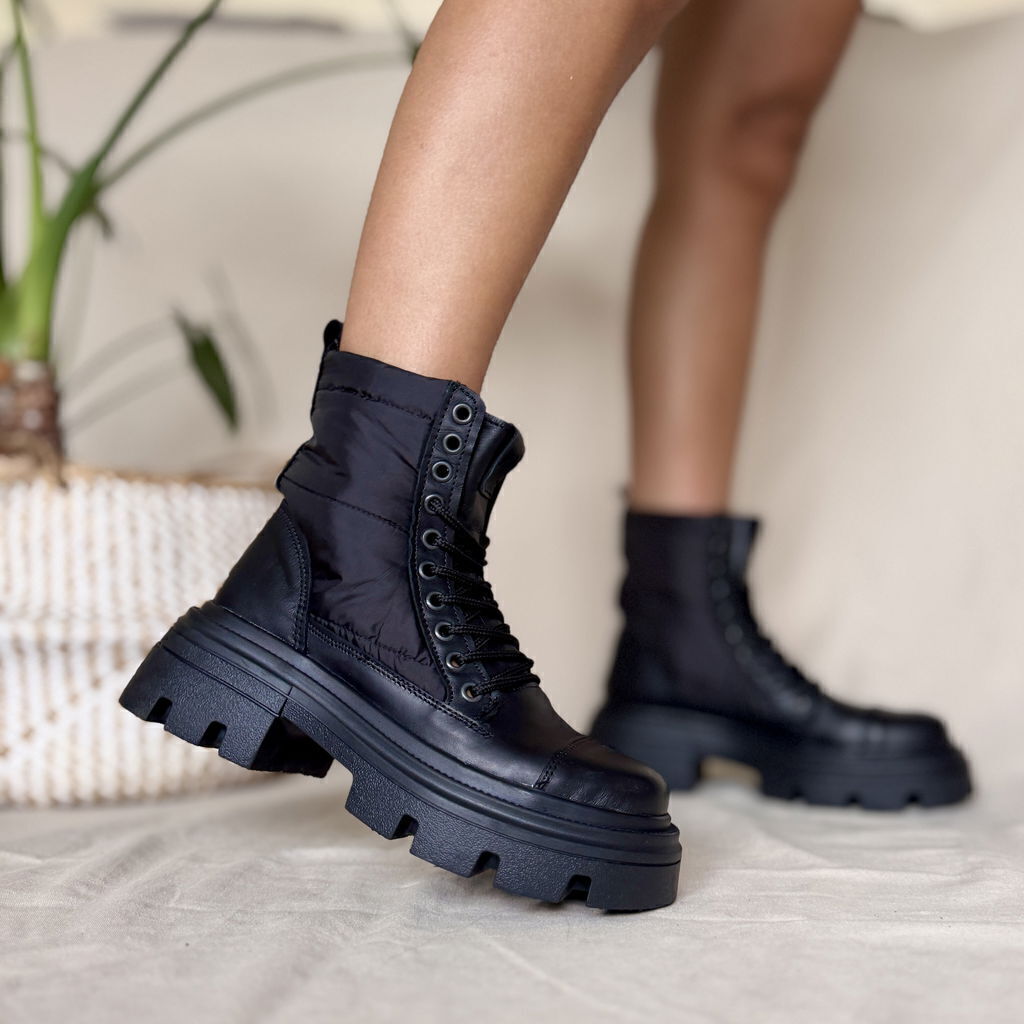 Borcego de cuero vacuno color negro combinado con material textil impermeable en caña